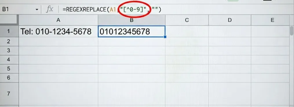 구글 스프레드시트는 엑셀보다 텍스트 처리에 강력한 함수인 REGEXREPLACE를 지원합니다. 이 함수를 쓰면 '숫자가 아닌 모든 것을 지워라'라는 명령을 내릴 수 있습니다.